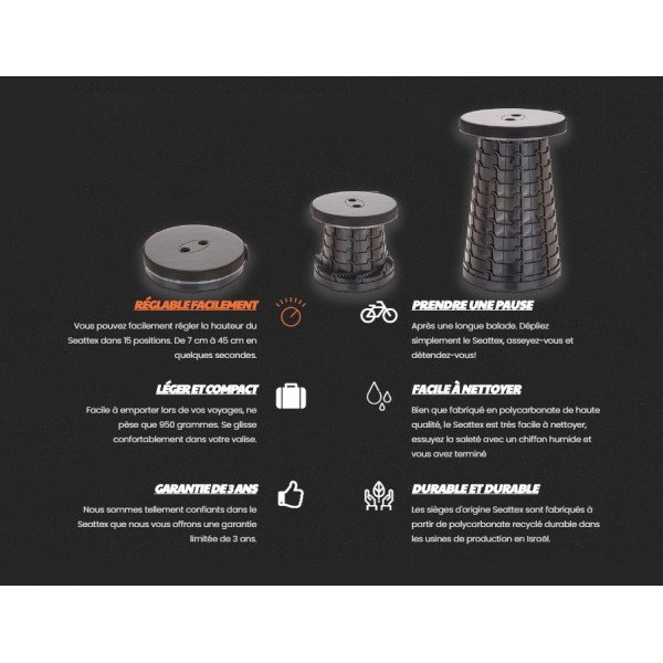 Son système de torsion innovant vous permet d’étendre le siège à la hauteur désirée jusqu’à 45 cm, puis de le replier rapidement pour un encombrement minimal. Une fois plié, ses dimensions compactes de 25 x 25 x 6,5 cm facilitent son rangement.