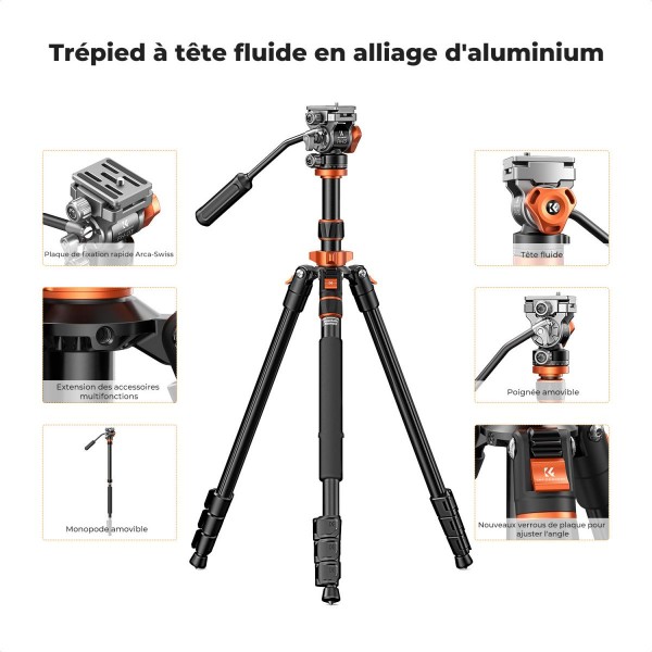 Le trepied peut supporter un poids maximum de 5 kilogrammes et utilise la technologie d'amortissement hydraulique pour obtenir un mouvement fluide de la rotule et fournir des effets de prise de vue stables et fluides.