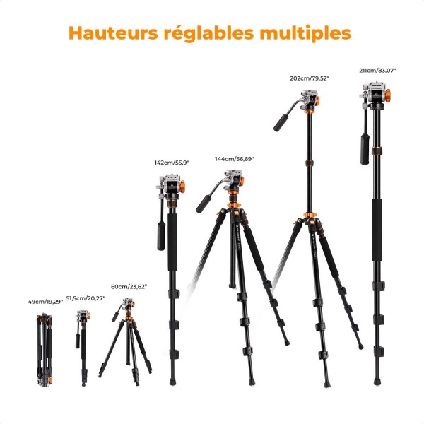 Le trépied peut être converti en monopode pour la prise de vue, et la hauteur maximale peut être augmentée à 211 cm grâce à l'ajout d'un axe central.