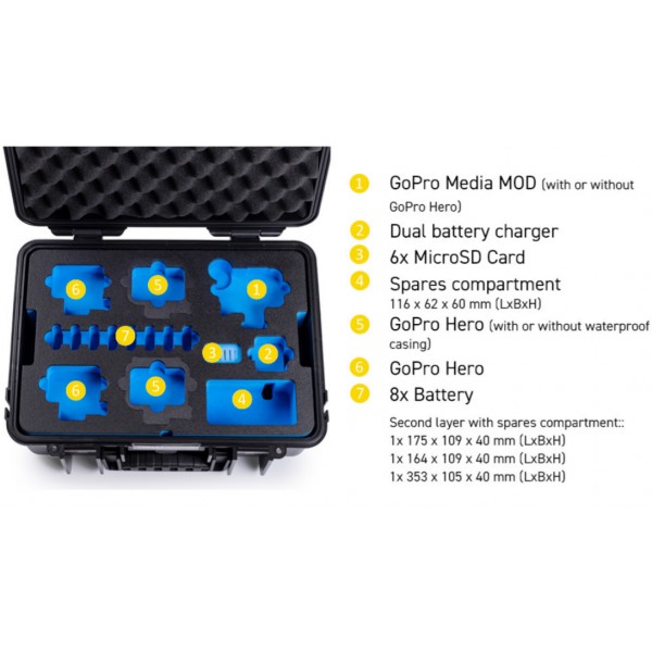 Grâce à son insert en mousse personnalisée, il offre suffisamment d'espace pour la GoPro Hero 9/10/11/12/13 et les accessoires : le double chargeur de batterie, jusqu'à 3 batteries, jusqu'à 7 microSD, des supports de montage et des câbles.