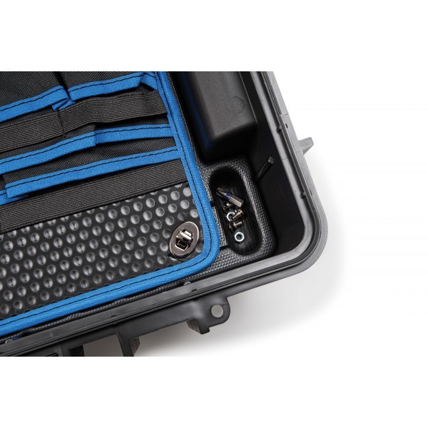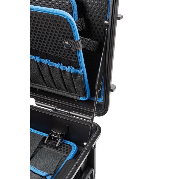 Les panneaux à outils à l'intérieur du boîtier sont soigneusement disposés et offrent de nombreux espaces pour divers outils. Le compartiment principal peut être personnalisé avec un système de séparation en aluminium et grâce à deux plateaux magnétiques intégrés, les petites pièces comme les vis trouvent également leur place. Très pratique : deux ressorts à gaz empêchent le couvercle de se fermer brusquement et garantissent un accès facile aux outils. Des roulettes et une poignée télescopique rendent la manipulation facile et le transport confortable.