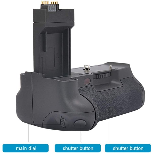 Le grip batterie est équipé d'un bouton d'obturation à prise verticale, d'un cadran principal, d'un verrouillage AE/verrouillage FE/bouton d'index/réduction, d'un bouton de sélection/grossissement du point AF, d'un bouton de compensation ouverture/exposition, support à vis pour trépied 1/4 ". Caractéristiques: