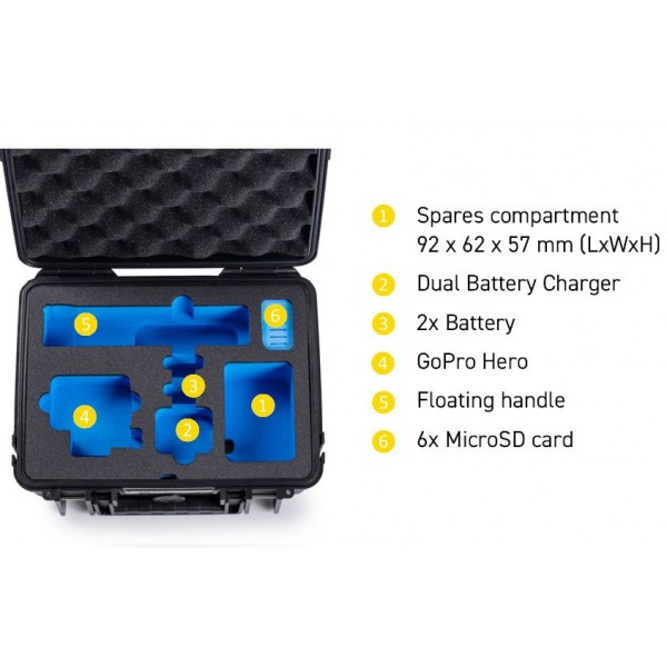 Grâce à son insert en mousse personnalisée, il offre suffisamment d'espace pour la GoPro 9, 10, 11, 12, 13 et les accessoires : le double chargeur de batterie, jusqu'à 3 batteries, jusqu'à 7 microSD, des supports de montage et des câbles.