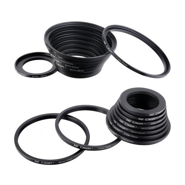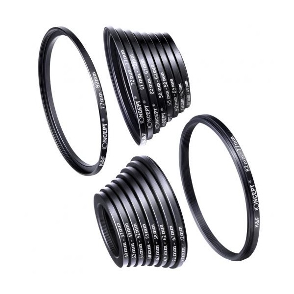 Comprend 9 bagues adaptables (37-49, 49-52, 52-55, 55-58, 58-62, 62-67, 67-72, 72-77, 77-82 mm)