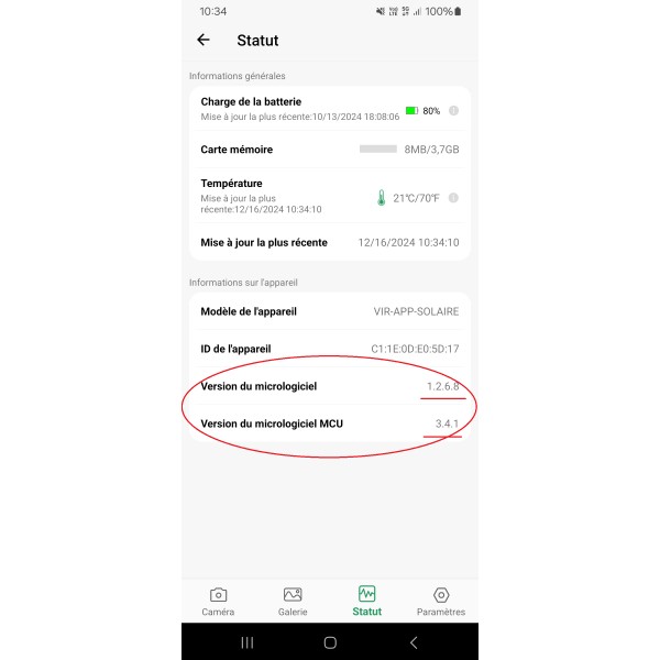 6. Vérifier sur l'onglet satut que la version du micrologiciel est bien la 1.2.6.8. et celle du micrologiciel MCU 3.4.1