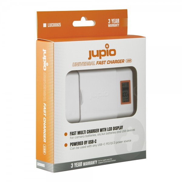 Chargeur universel JUPIO pour piles AA, AAA et batteries photo et vidéo.